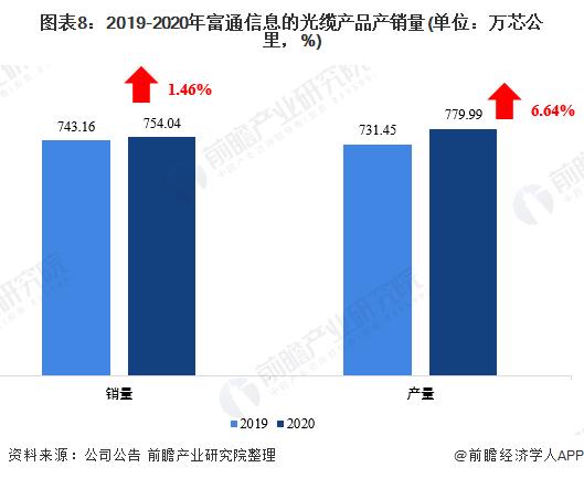 从销量来看,从2019年的842.8万芯公里下跌至2020年的824.38万芯公里,下降约2.19%。而2019年-2020年公司的光缆产品产销量呈现上升趋势;