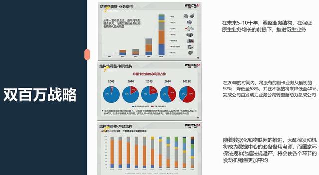 潍柴动力近5年提出了一个双百万的战略,第一是他要在未来的5年、10年进行一个产业结构的调整。在保证原生业务增长的前提下,推进衍生业务。什么叫衍生的业务呢?液压、大缸径发动机、燃料电池、智能物流、后市场服务等等。这些行业同时推进。进一步将原来的重卡业务,降低到40%左右。这个降低不是说原有的业务被压缩了,而是在原有业务发展的情况下,其他业务更快速地发展。把原有的业务压缩到了40%。