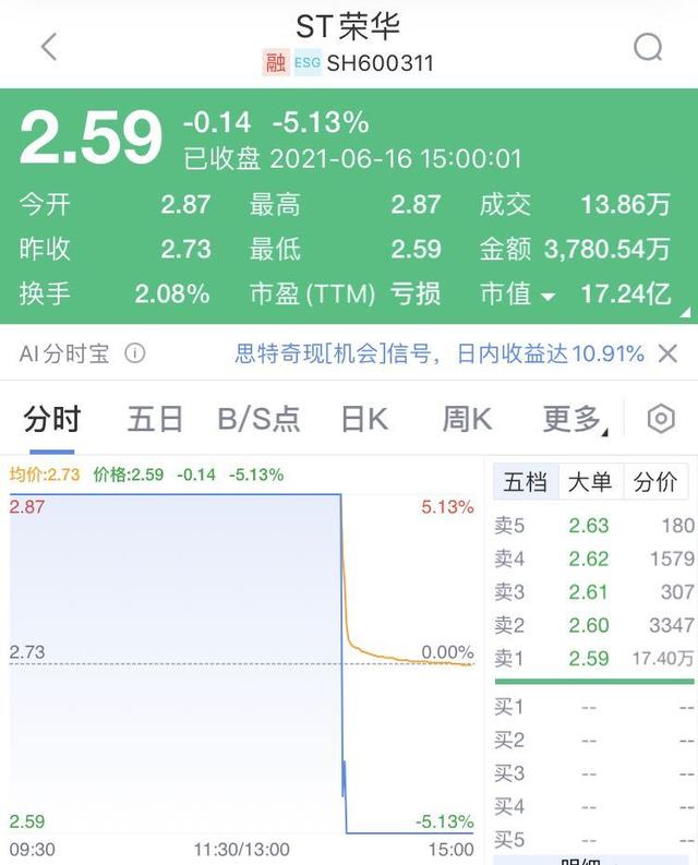 6月16日,ST荣华午后上演天地板,成交超3300万,换手1.8%,此前刚连收3个涨停板。截至收盘,该股大跌5.13%,报2.59元,成交超3700万,换手2.07%.