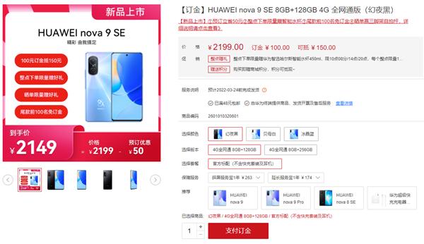 现在,华为nova 9 SE已经上架官网商城,定价8GB+128GB 2199元、8GB+256GB 2399元,订金100元可抵扣150元,实际到手价分别为2149元、2349元。