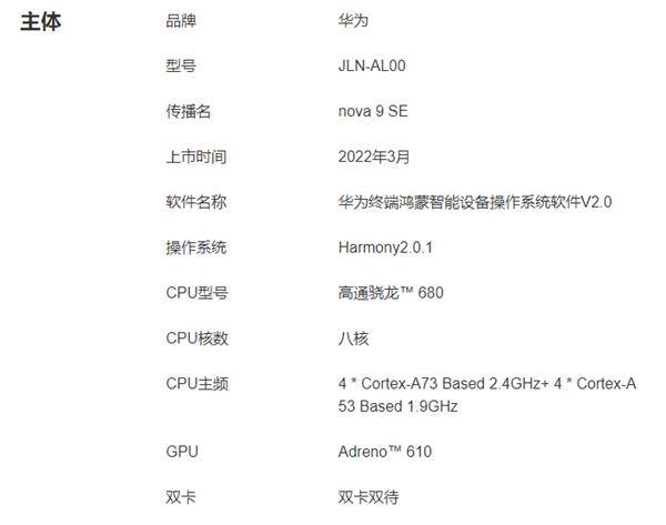 规格参数显示,nova 9 SE的处理器是骁龙680,今年初刚刚发布,台积电6nm工艺,集成六核心Kryo 265 CPU,包括四个A73 2.4GHz、四个A53 1.9GHz,同时集成Adreno 610 GPU、骁龙X11 4G基带,最高下行速度390Mbps、上行速度150Mbps。