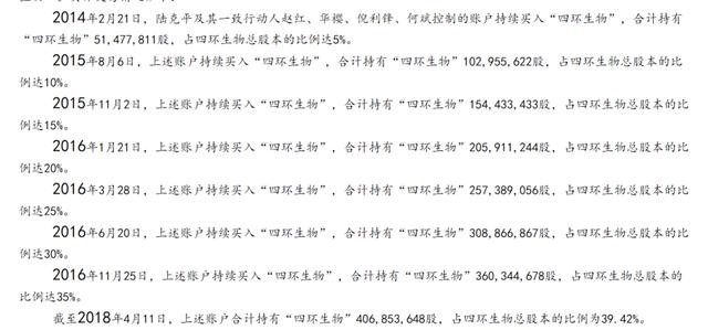 证监会查明,陆克平及其一致行动人赵红、华樱、倪利锋、何斌共同持有四环生物股票达 5%及每增加 5%时未履行报告、公告义务,且在限制交易期限内继续买卖四环生物股票。陆克平及其上述一致行动人控制的账户在限制交易期限内累计买入6.27亿股,累计买入金额43.21亿元;累计卖出2.72亿股,累计卖出金额19.51亿元。
