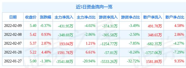 资金流向数据方面,上个交易日主力资金净流出431.95万元,游资资金净流出374.31万元,散户资金净流入491.7万元。近5日资金流向一览见下表: