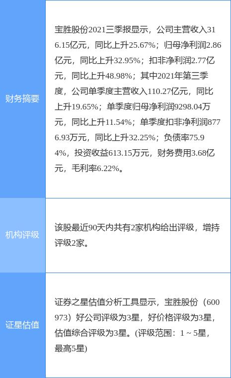宝胜股份股票(宝胜股份股票能否长线)2月10日盘中消息,9点54分宝胜股份(600973)封涨停板。目前价格5.94,上涨10.0%。资金流向数据方面,上个交易日主力资金净流出431.95万元,游资资金净流出374.31万元,散户资金净流入491.7万元。近5日资金流向一览见下表:宝胜股份主要指标及行业内排名如下:宝胜股份(600973)个股概况:以上内容由证券之星根据公开信息整理,如有问题请联系我们。