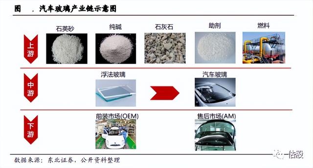 整个汽车玻璃产业链最上游为材料,如石英砂、纯碱、石灰石等,产业链下一步为浮法玻璃,由浮法玻璃进一步深加工为汽车玻璃,再供应给整车厂,最后由整车厂销售给企业或者个人。汽车玻璃位于整个汽车产业链偏上中游,其关键能力在于研发和管理。