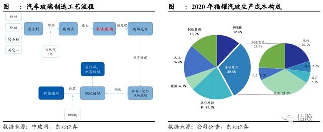 玻璃上游原材料包括硅砂、纯碱、钙石粉等,均为大宗商品,对汽车玻璃行业发展无制约。上述原材料按一定比例配制,经熔窑高温熔融,玻璃液从池窑连续流出并浮在金属液面上,摊成厚度均匀平整、经火抛光的玻璃带,冷却硬化后脱离金属液,再经退火切割而成的透明无色平板玻璃。浮法玻璃经过预处理后形成毛坯玻璃。毛坯玻璃的基础上经过热弯处理、钢化等流程形成钢化玻璃(强度更强,且破坏后无锐角,属于安全玻璃),钢化玻璃进一步做夹层处理、镀膜等最终形成汽车玻璃(进一步增加其安全性以及功能性)。