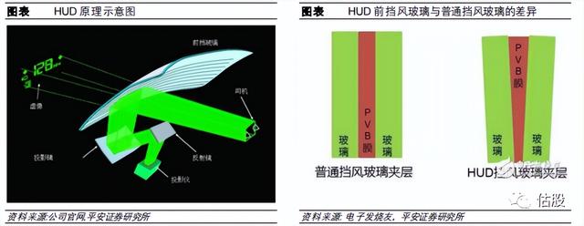 目前的HUD多为W-HUD,是直接使用汽车的挡风玻璃为显示设备,通过投影仪将行车信息投射到挡风玻璃上,由于需要降低重影前挡需要使用楔形 PVB 膜。AR-HUD 是通过内部特殊设计的光学系统将图像信息精确地结合于实际交通路况中,将胎压、速度、转速等信息投射到前挡风玻璃上。使车主在行车中无需低头就能查看汽车相关信息。