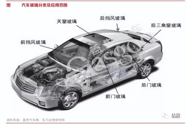 按照应用部位的不同,汽车玻璃可分为前挡风玻璃、后挡风玻璃、前门玻璃、后门玻璃、天窗玻璃等,据调查目前汽车玻璃的面积约占汽车表面积的 1/3。根据位置的不同以及车档次的不同,对汽车玻璃的功能要求以及需求量(主要差别在于是否安装天窗或天幕)存在一定的差异。