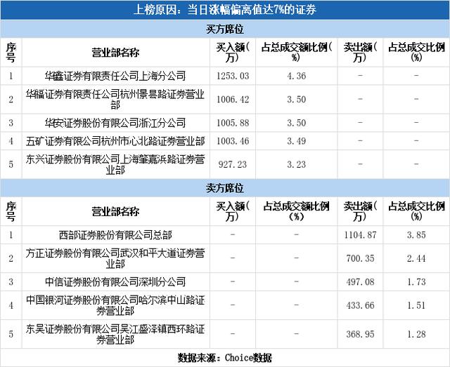 买一为华鑫证券股份上海分公司,该席位买入1253.03万元。近三个月内该席位共上榜1133次,实力排名第5。华鑫证券股份上海分公司今日还参与了倍杰特(净买额4880.12万元),信息发展(净买额4846.86万元),银河磁体(净买额3795.54万元)等27只个股。