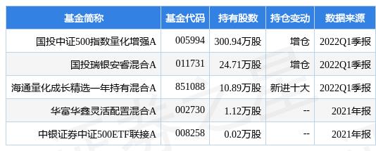 根据2022Q1季报基金重仓股数据,重仓该股的基金共3家,其中持有数量最多的基金为国投中证500指数量化增强A。国投中证500指数量化增强A目前规模为11.73亿元,最新净值2.0075(4月22日),较上一日下跌0.19%,近一年下跌0.16%。该基金现任基金经理为殷瑞飞。殷瑞飞在任的公募基金包括:国投瑞银金融地产ETF,管理时间为2013年10月26日至今,期间收益率为137.68%;国投瑞银中证资源指数,管理时间为2014年7月24日至今,期间收益率为127.63%;国投瑞银沪深300量化A,管理时间为2019年6月11日至今,期间收益率为34.87%。