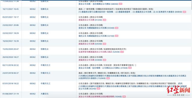 港交所官网显示,信阳毛尖多次发布更改名称公告