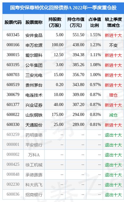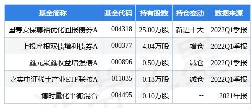 根据2022Q1季报基金重仓股数据,重仓该股的基金共4家,其中持有数量最多的基金为国寿安保尊裕优化回报债券A。国寿安保尊裕优化回报债券A目前规模为3.23亿元,最新净值1.026(3月22日),较上一日下跌0.1%,近一年上涨2.91%。该基金现任基金经理为陶尹斌 丁宇佳 冒浩。丁宇佳在任的公募基金包括:国寿安保尊益信用纯债债券,管理时间为2021年3月15日至今,期间收益率为6.25%;国寿安保泰和纯债债券,管理时间为2021年3月15日至今,期间收益率为4.49%;国寿安保泰荣纯债债券,管理时间为2021年3月15日至今,期间收益率为3.88%。陶尹斌在任的公募基金包括:国寿安保中债1-3年指数A,管理时间为2019年3月6日至今,期间收益率为10.72%;国寿安保泰恒纯债债券,管理时间为2019年6月27日至今,期间收益率为8.79%;国寿安保泰弘纯债债券,管理时间为2019年7月23日至今,期间收益率为9.44%;国寿安保尊益信用纯债债券,管理时间为2019年8月1日至今,期间收益率为15.9%。