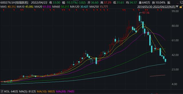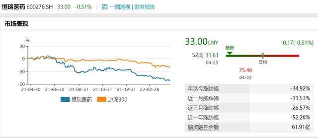 恒瑞医药曾是资本市场的明星,有“A股药王”、“医药一哥”和“医药白马股”等一众光环加身。在股价方面,去年1月恒瑞医药股价来到每股97.16元的历史最高点,但一年后的本月22日,其股价收报每股33元,已经跌超7成。市值较历史高位蒸发超3000亿元。