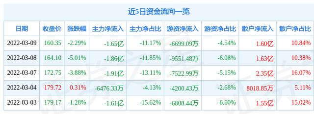 资金流向数据方面,上个交易日主力资金净流出1.65亿元,游资资金净流出6699.09万元,散户资金净流入1.6亿元。近5日资金流向一览见下表: