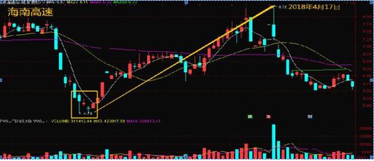 如上图,我们发现在上行的过程中该股出现了天量上涨的现象。在这样的情况下很多投资者会认为天量出现,同时之后又连续几天的小阴是庄家在出货的表现,而卖掉手中的股票。其实不然,按照我们的方法,观察天量之后的股价变化我们可以看到上图中不是那么明显的启明星形态。同时在天量后的回调中股价并未出现大幅阴跌而是小幅的回调。在此时我们可以选择“启明星”形态出现时入场,也可以在天量后的最近一个收阳处入场。但是这一方法一定要待天量后观察,忌讳天量当天入场。