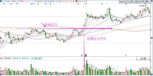 上图中股价震荡上行,两次在几乎相同的位置股价回调,但之后成交量开始放大,不仅突破了前期压力平台,还突破了年线的压力站上年线。之后股价继续延续震荡上行的趋势。在这样的情况下,我们选择突破阻力作为入场点,是在确认了多空双方的力量情况下而选择的策略,比较安全。如上图,就可以选择当股价突破年线时入场,那么我们即便是做短线其收益也是诱人的。