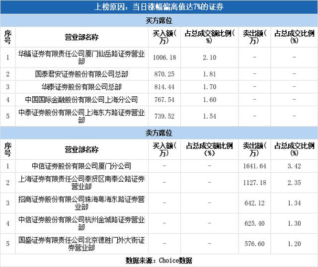 买三为华泰证券营业总部(非营业场所),该席位买入814.44万元。近三个月内该席位共上榜708次,实力排名第6。华泰证券营业总部(非营业场所)今日还参与了华塑股份(净买额-8170.00万元),国网信通(净买额-3393.17万元),九洲药业(净买额2927.79万元)等10只个股。