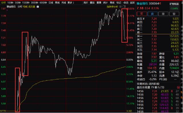 这里面尤为引人注目的是豫金刚石。行情分时图显示,豫金刚石开盘以跌停价报于5.31元,但经过连续拉升后,临近尾盘一度触及7.97元的涨停板。