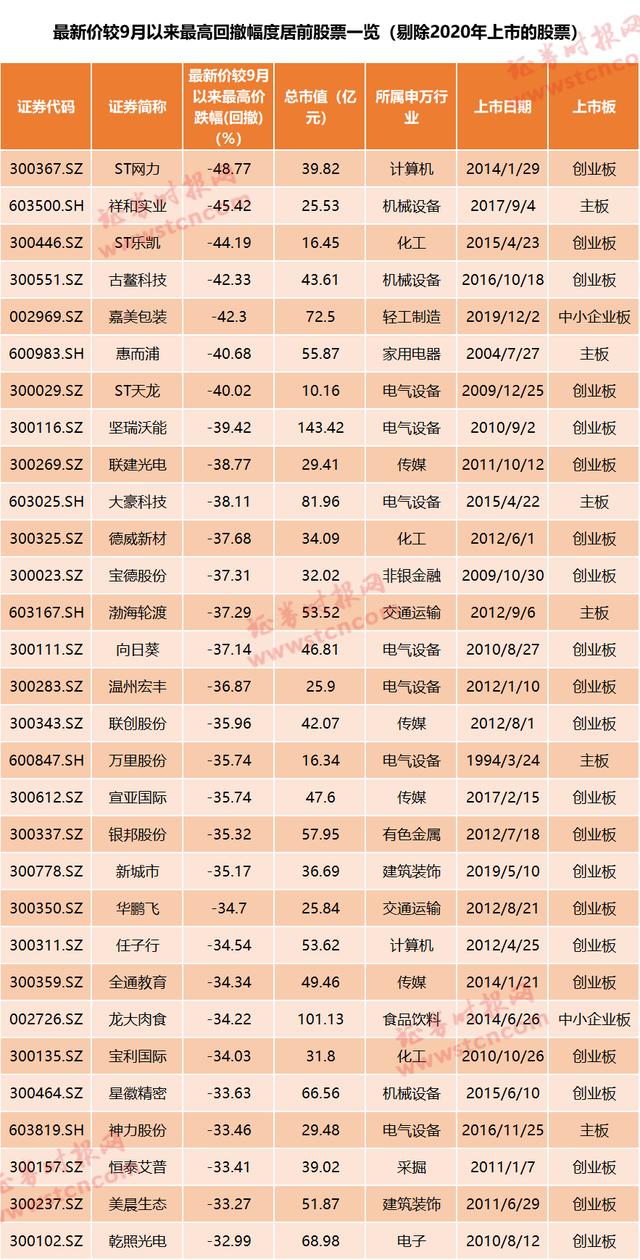 统计数据显示,在剔除今年上市的次新股后,有1804只股票较9月以来高位调整幅度超过10%,其中318股调整幅度超过20%,51只股票调整幅度超过30%。