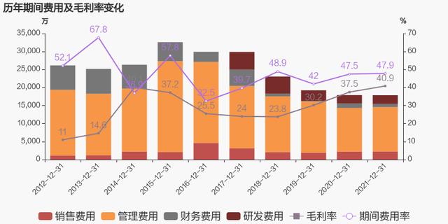 公司2021年营业成本2.2亿,同比下降6.5%,高于营业收入1%的下降速度,毛利率上升3.5%。期间费用率为47.9%,同去年相比变化不大。经营性现金流大幅下降87.2%至3520.6万。