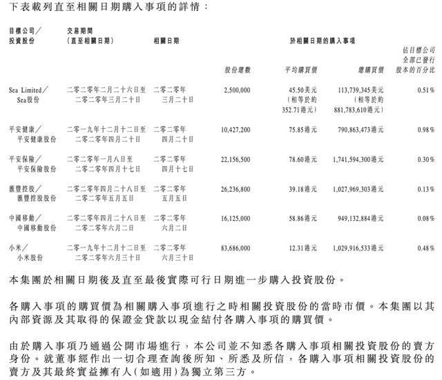 但2020年11月,合生创展曾首次披露过一则与公司股权投资业务相关的公告。彼时公告显示,从2019年底开始,合生创展合计斥资64亿元,购入Sea、小米集团、平安好医生、中国平安、汇控、中国移动等6只股票。