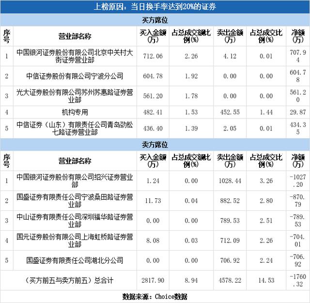买一为中国银河证券北京中关村大街证券营业部,该席位买入712.06万元,卖出4.12万元,净买额为707.94万元。近三个月内该席位共上榜166次,实力排名第26。中国银河证券北京中关村大街证券营业部今日还参与了仁东控股(净买额3079.44万元),延华智能(净买额1708.73万元),漳州发展(净买额-807.72万元)等4只个股。