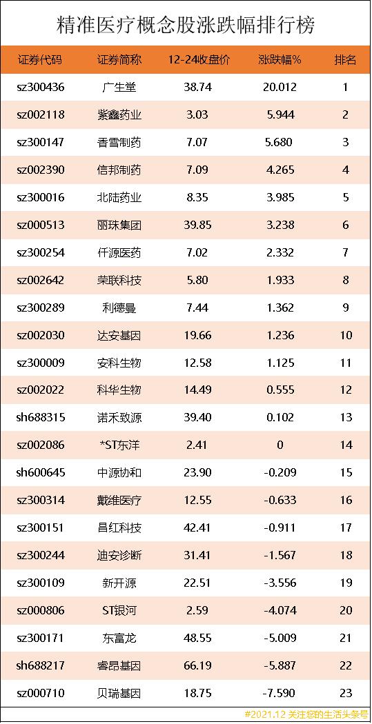 精准医疗概念股涨跌幅排行榜