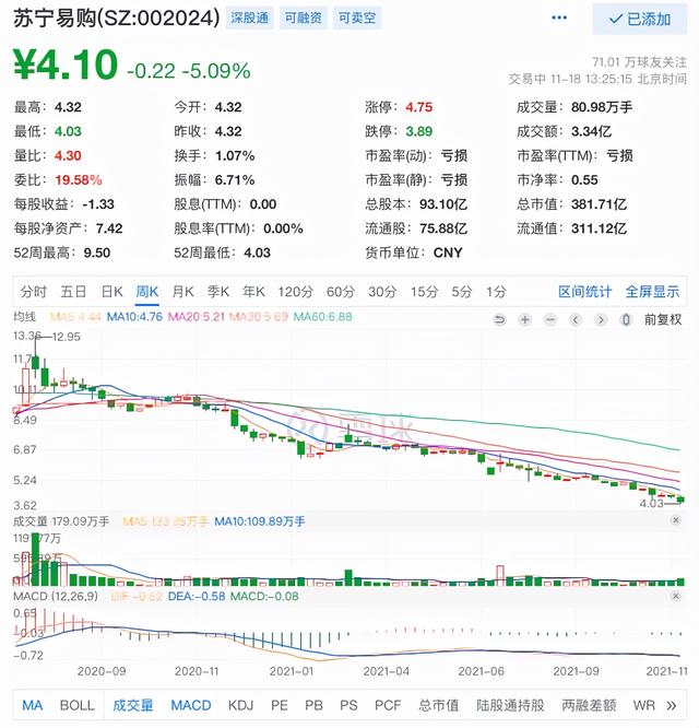11月18日消息,电商巨头苏宁易购盘中继续下行,早盘报4.03元/股,总市值380亿元。