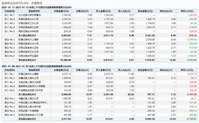 自1月6日至今,宜宾纸业已经多次登上龙虎榜。华西证券股份有限公司自贡五星街证券营业部、华西证券股份有限公司宜宾北正街证券营业部、光大证券股份有限公司北京总部基地证券营业部、湘财证券股份有限公司台州祥和路证券营业部均两次现身龙虎榜。财通证券股份有限公司杭州上塘路证券营业部三次均上榜。