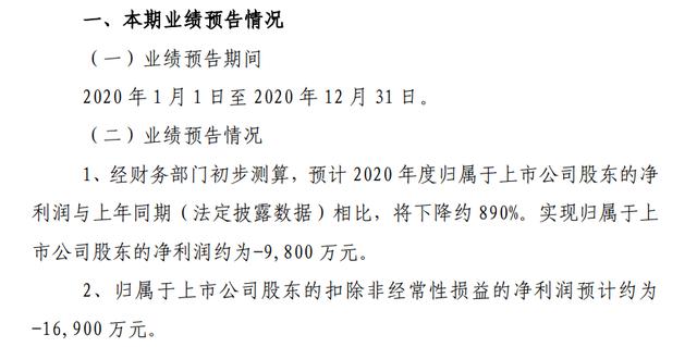 2020年扣非净利润预计巨亏1.69亿