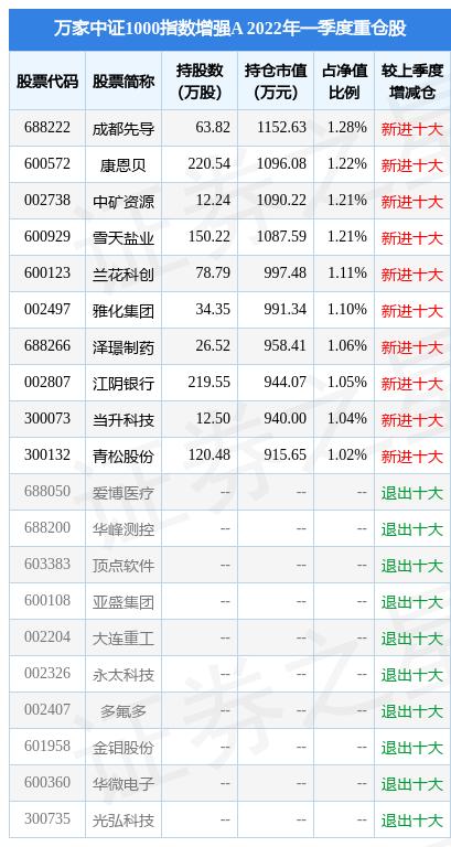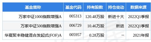 根据2022Q1季报基金重仓股数据,重仓该股的基金共2家,其中持有数量最多的基金为万家中证1000指数增强A。万家中证1000指数增强A目前规模为4.06亿元,最新净值1.2366(3月22日),较上一日下跌0.32%,近一年上涨24.13%。该基金现任基金经理为乔亮。乔亮在任的公募基金包括:万家量化睿选混合,管理时间为2019年8月21日至今,期间收益率为26.83%;万家沪深300指数增强A,管理时间为2019年9月6日至今,期间收益率为32.8%;万家中证500指数增强A,管理时间为2019年9月6日至今,期间收益率为46.29%。