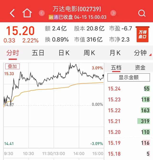 截至4月15日,万达电影今年以来股价下跌了16.25%,公司最新股价为15.20元,总市值316亿元。
