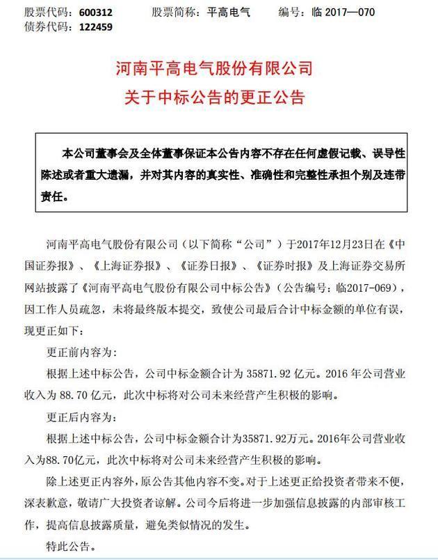 12月24日下午,平高电气发布更正公告,其解释道:22日发布的中标公告中,因“工作人员疏忽,未将最终版本提交”,导致出现了“公司中标金额合计为35871.92亿元”的错误,实际中标额应为35871.92万元,即约3.6亿元。前后数据相差了约3.59万亿元。