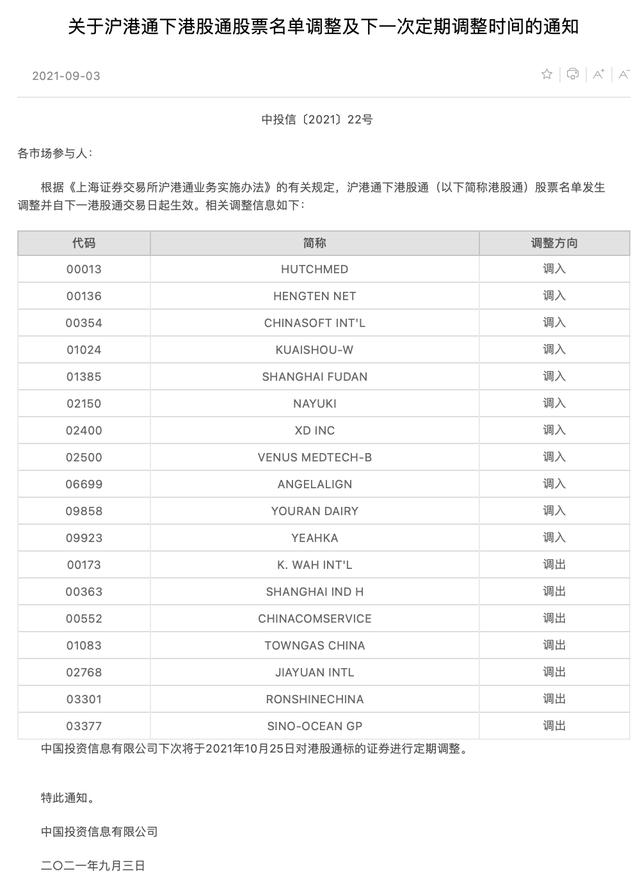 9月3日,上交所发布《关于沪港通下港股通股票名单调整及下一次定期调整时间的通知》,根据《上海证券交易所沪港通业务实施办法》的有关规定,沪港通下港股通股票名单发生调整并自下一港股通交易日起生效。调入名单包括和黄医药、恒腾网络、中国软件国际、快手-W、上海复旦、奈雪的茶等。中国投资信息有限公司下次将于2021年10月25日对港股通标的证券进行定期调整。