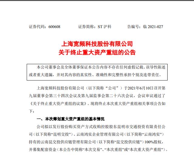 6月10日晚间,ST沪科(600608.SH)发布公告称,终止重大资产重组,公司原拟以发行股份购买资产方式收购控股股东持有的昆交投供应链100%股权,并募集配套资金。ST沪科表示,受新冠肺炎疫情以及目前市场环境等因素影响,现阶段继续推进重大资产重组的条件尚不成熟,继续推进本次重大资产重组事项可能面临较大不确定。