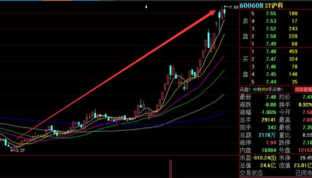 截至今日收盘,ST沪科报7.48元/股,收跌1.06%。