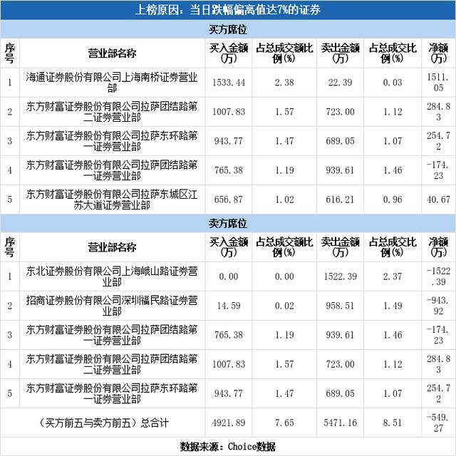 买三、卖五均为东方财富证券拉萨东环路第一证券营业部,该营业部买入943.77万元,卖出689.05万元,净买额为254.72万元。近三个月内该席位共上榜553次,实力排名第11。东方财富证券拉萨东环路第一证券营业部今日还参与了哈三联(净买额660.33万元),*ST节能(净买额613.46万元),中银绒业(净买额-437.41万元)等9只个股。