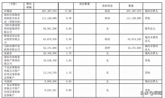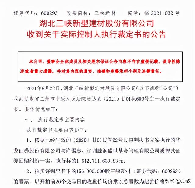 项乾君按:9月23日,三峡新材(600293.SH)发布公告,公司实际控制人许锡忠持有的1.56亿股股份将被司法拍卖。面对高达15.13亿的执行标的而言,1.56亿股被拍卖后,还有近9亿元的窟窿无法填补。
