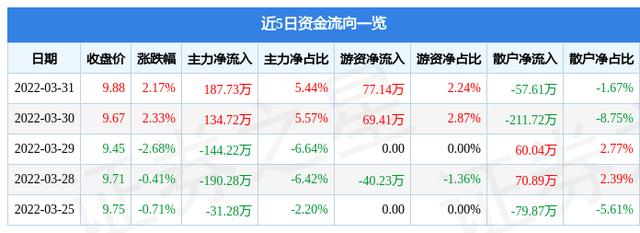 资金流向数据方面,上个交易日主力资金净流入187.73万元,游资资金净流入77.14万元,散户资金净流出57.61万元。近5日资金流向一览见下表: