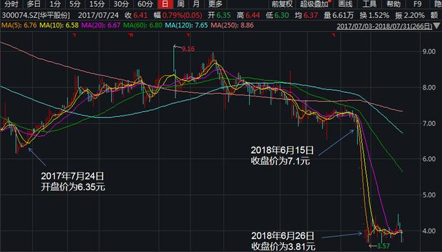 2017年7月24日至2018年6月15日(多日跌停的前一交易日),华平股份股票价格从6.35元/股上涨至7.1元/股,涨幅11.8%,期间最高价8.86元/股,6月19日至6月26日股票出现多日跌停,截至6月26日,收盘价为3.81元/股。操纵期间账户组亏损32372.33万元。