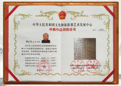 艺术成就的高低,既需业内认可,更需市场与时间的检验。李云飞的指墨艺术,早已在权威认证与市场表现中彰显其珍贵价值。2018年,文旅部、中书协、中美协三家权威机构联合为其颁发润格证书,认定其书法每平尺6万元、国画每平尺8万元,这一认证标志着其艺术价值获得国家级权威背书。