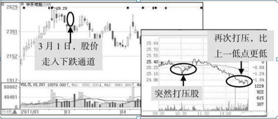 【实例剖析】华芳纺织(600273)在2011年3月25日(星期五)的分时图和K线情况,首先从当日的分时图中看到股价全天都处于震荡下跌的趋势。临到收盘前,突然出现拉高股价的现象,成交量也出现了放大现象。再来看看当日对应的日K线图中,可以看到3月25日当日收出一根小阴线,第二个交易日,即周一开市时股价继续上涨,并创出了新高,看到这样的情形,散户都会大胆跟进,以为主力要拉升股价了,但恰恰相反,股价到了周二就开始下跌,而后走出了一段长时间的下跌行情,其实这里主力的真正目的是出货,而不是拉升股价,如下图所示。