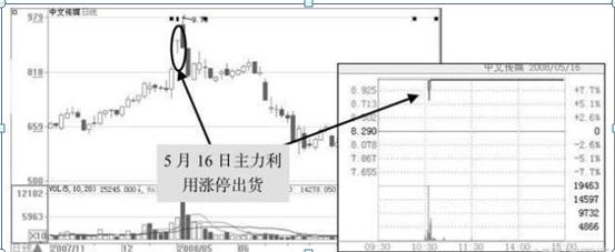 【实例剖析】中文传媒(600373)于2008年5月16日出现了涨停,股价一开盘就封住了涨停板,而后又打开涨停板,最后再次封住涨停板。调出该日对应的日K线图,可以看到当日股价处于高位区域,第二日股价创出新高点9.79元,而后股价开始走软,进入下跌行情。其实3月16日的涨停是主力的一个骗局,主力利用涨停吸引更多的跟风盘进入,而自己却在悄悄出货,所以后市股价会下跌,如下图所示。