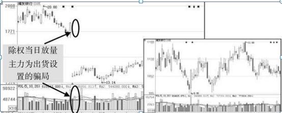 除权放量大多是主力对倒拉升派发。主力利用除权,使股票的绝对价位大幅降低,从而使投资者的警惕性降低,由于投资者对强主力股的印象极好,因此在除权后低价位放量拉高时,都以为主力再起一波,做填权行情。吸引大量跟风盘介入,主力边拉边派,此时已进场的投资者看到还没有很多利润,于是不会出局,而未进场投资者的觉得升幅不大可以跟进。再加上股评的吹捧,主力就在散户的帮助下,把股票兑现为现金,顺利出逃。因此,对于除权的个股必须进行复权处理,让股价波动保持一种持续性,以避免掉入主力的陷阱。