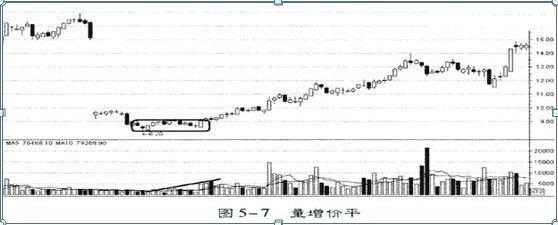 所谓量增价平,是指个股(或大盘)在成交量增加的情况下,个股的股价却几乎维持在一定价位水平上下波动的一种量价配合现象(图5-7)。