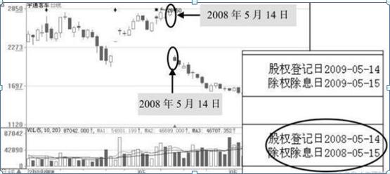 在实际情况下,股价除权后比除权之前低很多,显示在K线图中就会出现一个很大的缺口,股价除权除息在K线图上的表现如下图所示。