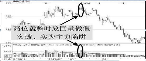 【实例剖析】海油工程(600583)于2011年2月中旬进入高位盘整阶段,在这个阶段中股价始终不涨也不跌,一直处于盘整趋势,此时散户有了前车之鉴后,却误以为此时的盘整为主力在洗盘,经过近一个月的盘整,股价于2011年3月9日跳空高开,并收出一根大阳线,并且当日成交量放出巨量,散户就误以为主力开始拉升股价了,于是赶快买入,但其实这时的巨量是假突破,是主力为了出货而设置的一个骗局,而后股价走入下跌行情,如图所示。