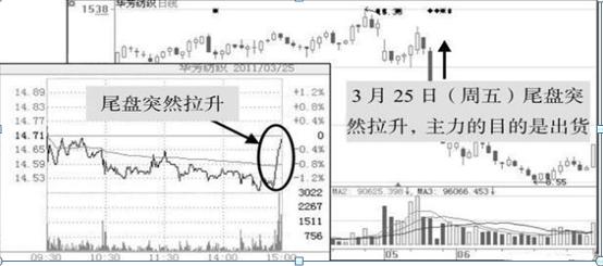 主力利用收市前几分钟用几笔大单放量拉升,刻意拉高收市价。此现象在周五时最为常见,主力把图形做好,吸引股评专家免费推荐,欺骗投资者以为主力拉升在即,周一开市,这些散户就会大胆跟进。此类操盘手法的主力一般实力较弱,资金不充裕,只敢打游击战,不敢正面进攻。尾市拉高,让散户连打单进去的时间都没有。