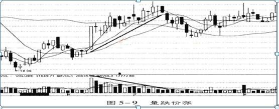 如果股市经过长期一轮下跌后企稳,此时庄家操纵股价开始小幅上升,成交量还在减少,意味着股市底部基本形成,空头态势转为多头态势指日可待,可以考虑建仓。如果股市经过长期一轮上升后不太稳定,此时股价继续上升,成交量开始减少,投资者要警惕股市可能由多头态势转为空头态势,最好提前平仓(图5-9)。