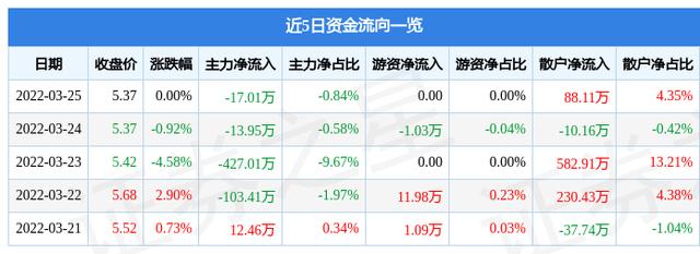 资金流向数据方面,上个交易日主力资金净流出17.01万元,游资资金净流入0.0万元,散户资金净流入88.11万元。近5日资金流向一览见下表: